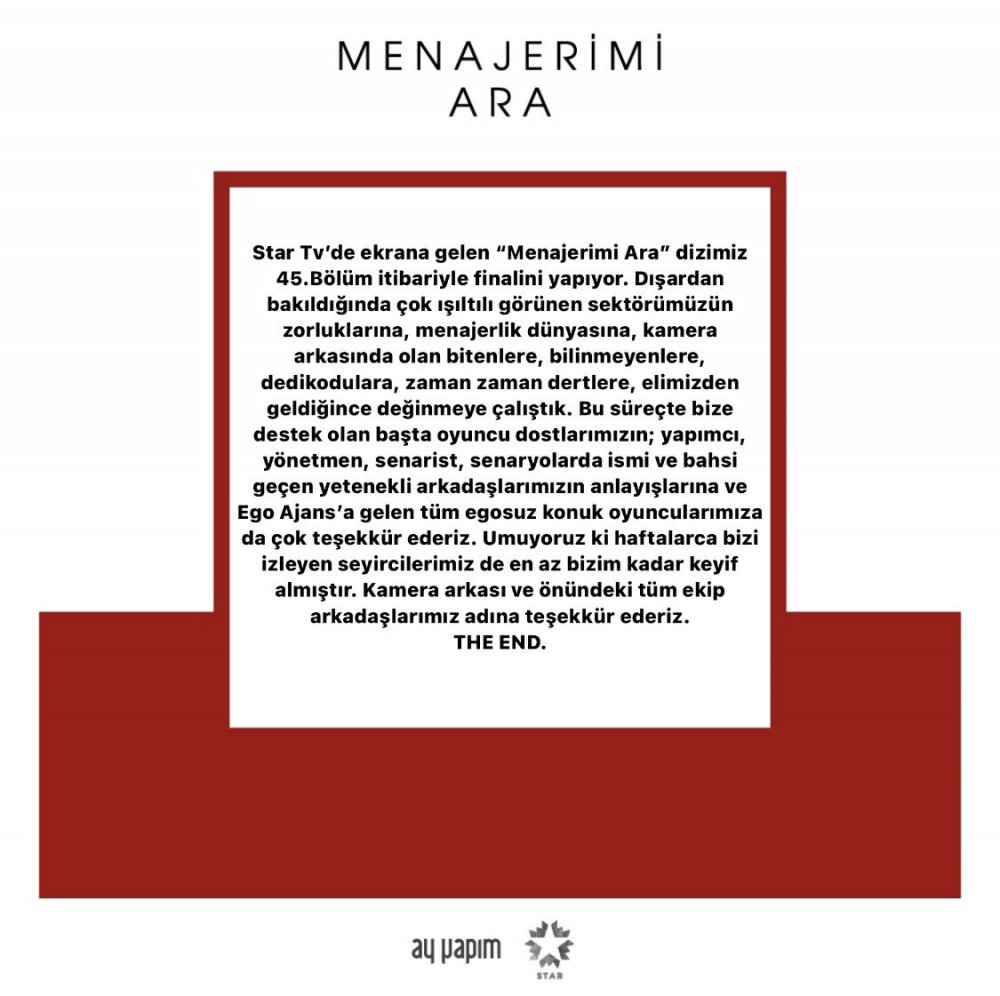 Star’ın sevilen dizisi Menajerimi Ara ile ilgili yapım şirketi Ay Yapım'dan final açıklaması yapıldı.