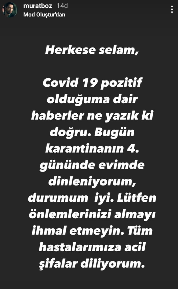 Türk pop müziğinin iddialı ismi Murat Boz hayranlarına kötü haberi verdi. Sosyal medya hesabından paylaşım yapan şarkıcı koronavirüse yakalandığını belirtti.