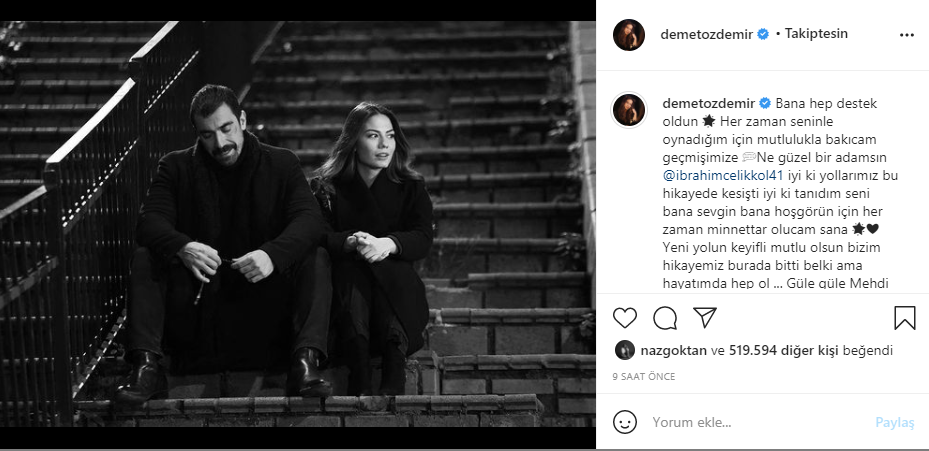 Doğduğun Ev Kaderindir dizisinde başrolü paylaştığı partneri İbrahim Çelikkol'un diziye vedasının ardından Demet Özdemir duygu dolu bir paylaşım yaptı.