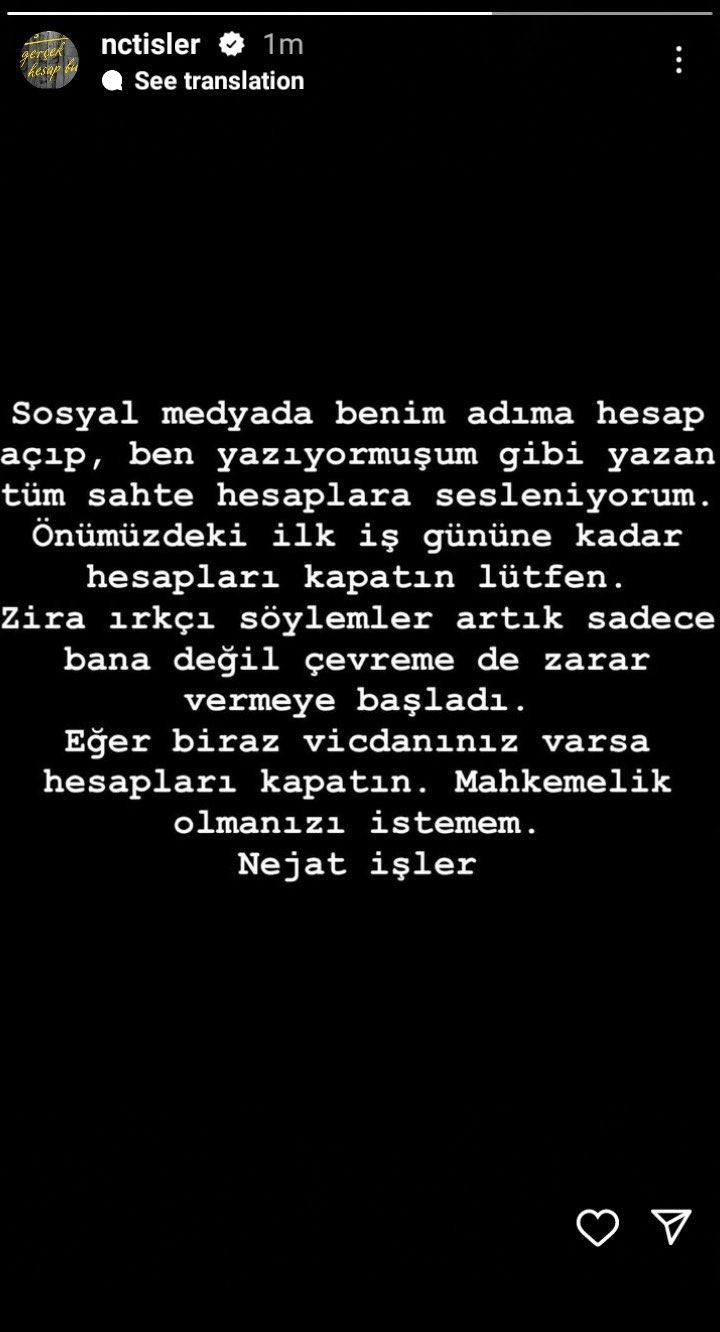 Nejat İşler Instagram hesabından açıklama yaptı ve sahte hesaplara seslendi.