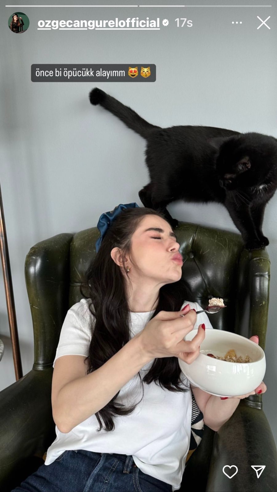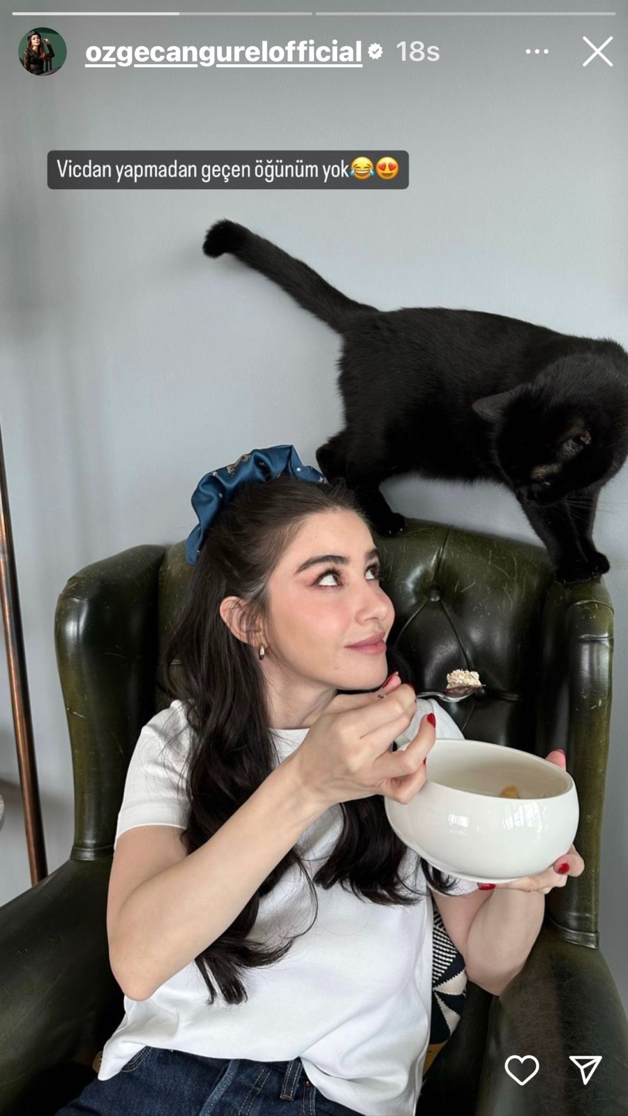 Oyuncu Instagram hesabından paylaştığı karelere "Vicdan yapmadan geçen öğünüm yok" ve "Bir öpücük alayım" notunu düştü.
