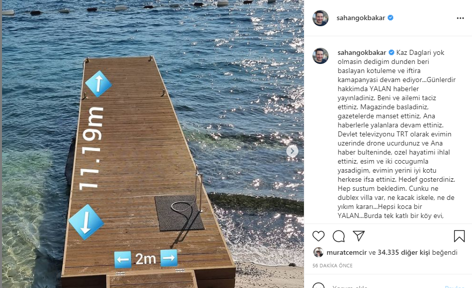 Devlet televizyonu TRT olarak evimin uzerinde drone ucurdunuz ve Ana haber bulteninde, ozel hayatimi ihlal ettiniz, esim ve iki cocugumla yasadigim, evimin yerini iyi kotu herkese ifsa ettiniz. Hedef gosterdiniz. Hep sustum bekledim. Cunku ne dublex villa var, ne kacak iskele, ne de yıkım kararı...Hepsi koca bir YALAN...