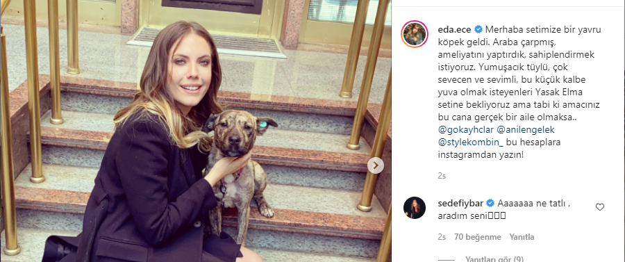Oyuncu minik köpekle fotoğraflarını paylaşarak şu ifadeleri kullandı; "Merhaba setimize bir yavru köpek geldi. Araba çarpmış, ameliyatını yaptırdık, sahiplendirmek istiyoruz. Yumuşacık tüylü, harika desenli, çok sevecen ve sevimli, bu küçük kalbe yuva olmak isteyenleri Yasak Elma setine bekliyoruz ama tabi ki amacınız bu cana gerçek bir aile olmaksa..."
