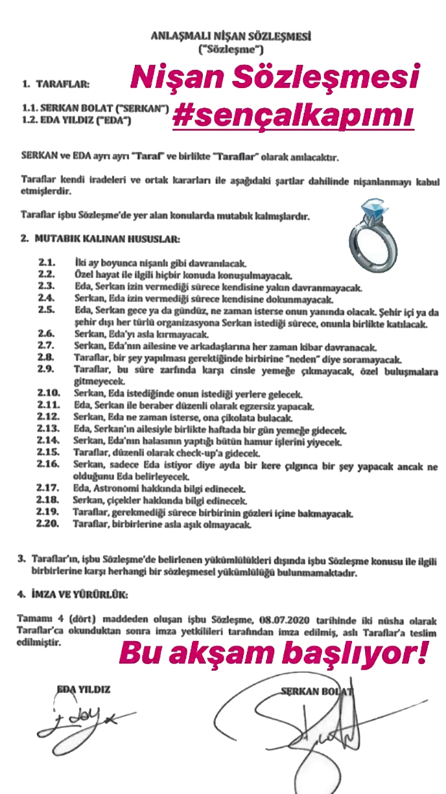 Bülbüloğlu, ikilinin Nişan Sözleşmesi'ne yer verdi. "Taraflar kendi iradeleri ve ortak kararları ile aşağıdaki şartlar dahilinde nişanlanmayı kabul etmişlerdir." yazan sözleşmede, nişanın 2 ay süreceğinden, Serkan'ın Eda ne zaman isterse ona çikolata alacağına, Eda'nın düzenli olarak Serkan'la egzersiz yapacağına kadar birçok madde yer alıyor.