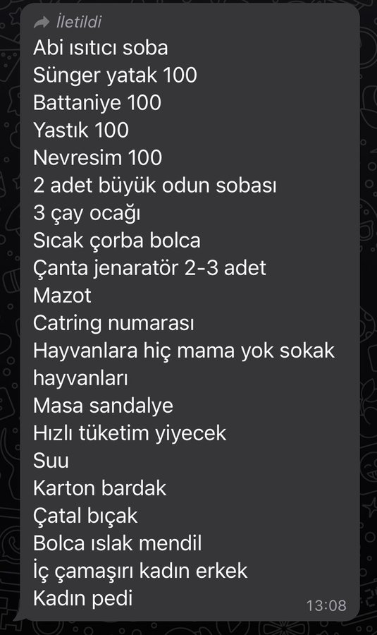 Oyuncu; "Ay Yapım ve ihtiyaç haritasının bölgedeki ekiplerinden gelen ihtiyaç listesini paylaşıyorum sen de etrafına ulaştırmak istersen diye Bugün 17.00 ye kadar Beykoz Kundura'ya (Ay Yapım aracına), yetişmezse yarın Dasdas'a (ihtiyaç haritası aracına) ulaştırılabilir." dedi.
