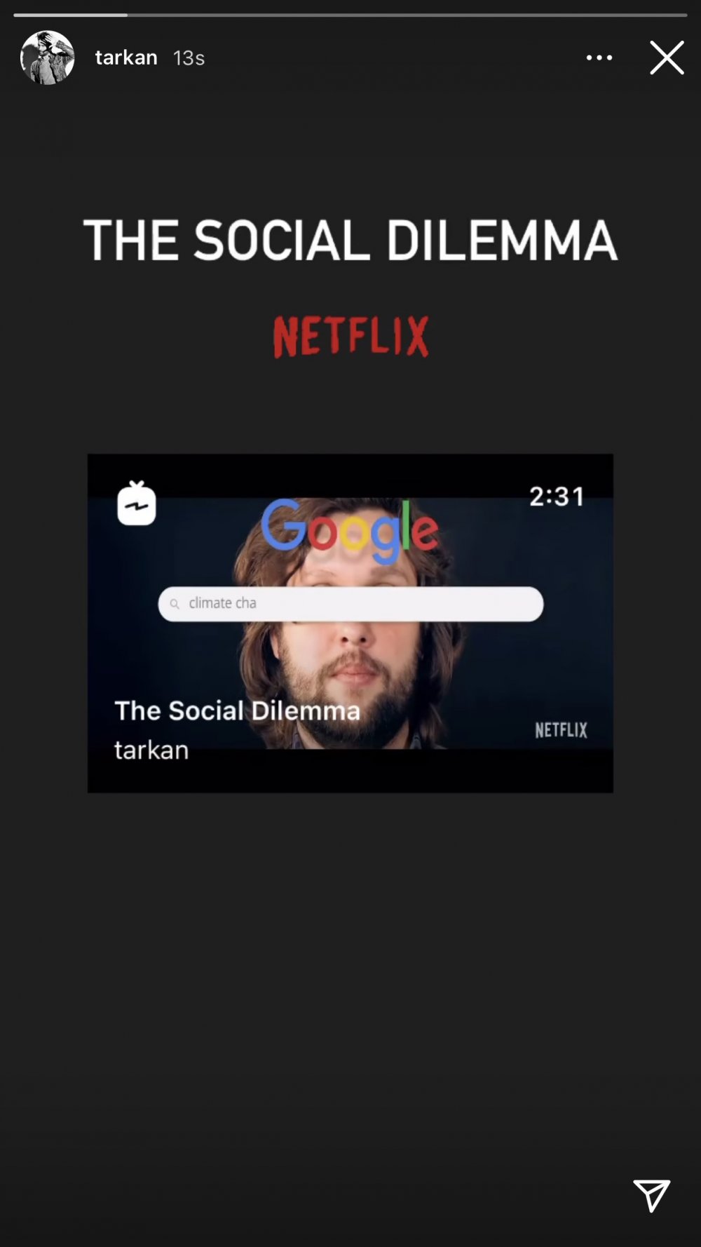 Tarkan, Instagram hesabından Netflix'in ilgi çeken belgeseli Sosyal İkilem'e hikayesinde yer verdi.
