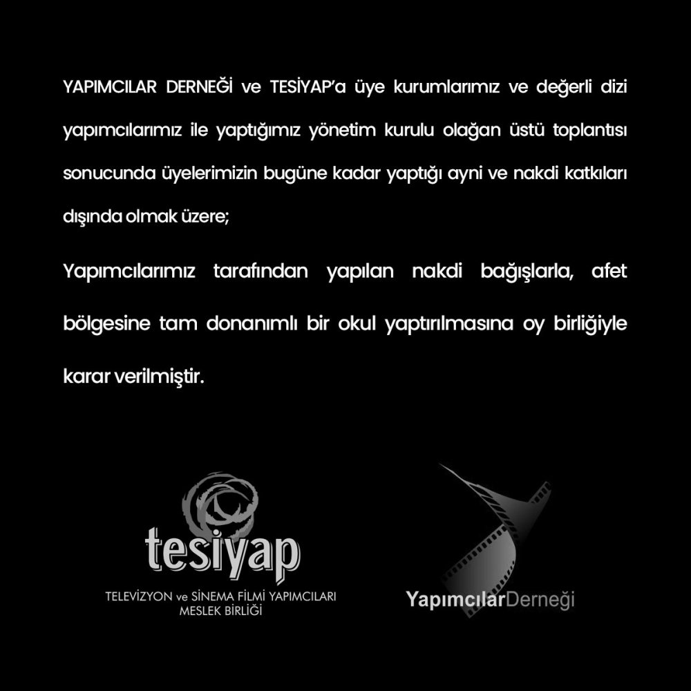Yapılan açıklamada şöyle dendi "Yapımcılar Derneği ve TESİYAP’a üye kurumlarımız ve değerli dizi yapımcılarımız ile yaptığımız yönetim kurulu olağan üstü toplantısı sonucunda üyelerimizin bugüne kadar yaptığı ayni ve nakdi katkıları dışında olmak üzere... "