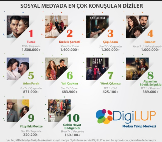 MTM Medya Takip Merkezi’nin profesyonel sosyal medya dinleme servisi Digilup sonuçlarına mart ayında sosyal medyada en çok konuşulan diziler belli oldu.