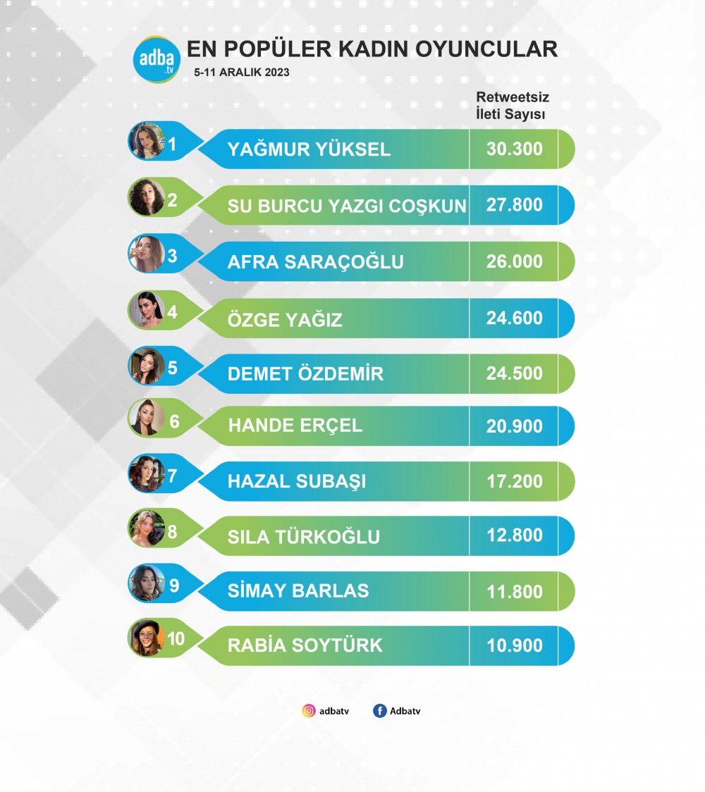 Adba 5-11 Aralık arasında sosyal medyada en çok konuşulan kadın oyuncuları belirledi. Çıkan sonuca göre, en çok konuşulan kadın oyuncu Yağmur Yüksel oldu.
