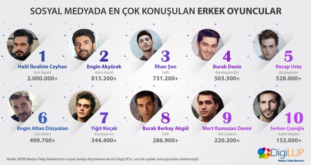 MTM Medya Takip Merkezi’nin profesyonel sosyal medya dinleme servisi DigiLUP verilerine göre, son 1 aydaki erkek oyuncular sıralamasının zirvesinde Halil İbrahim Ceyhan var.