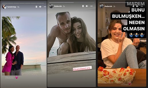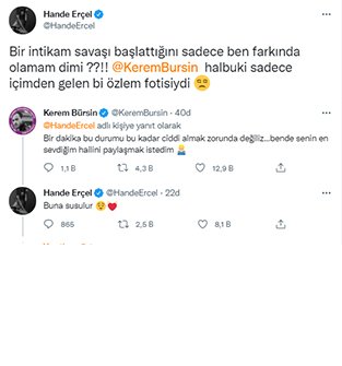 Bursin'e olan özlemini birlikte oldukları bir fotoğrafla anlatan Erçel'e Bursin de karşılık verdi ve arşivden fotoğraflar paylaştı. Paylaşımlar sonrası Hande Erçel ve Kerem Bursin'in Twitter üzerinde yaptıkları mesajlaşma ise takipçileri tarafından çok beğenildi.