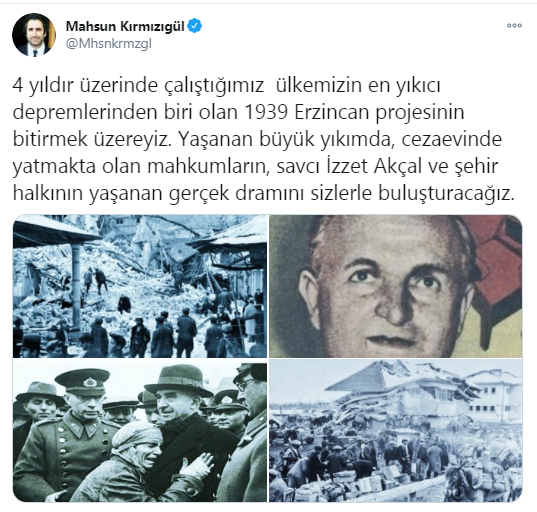 Kırmızıgül Twitter hesabından yaptığı paylaşımda yeni sinema filmine dair bilgi verdi ve şu ifadeleri kullandı: "4 yıldır üzerinde çalıştığımız ülkemizin en yıkıcı depremlerinden biri olan 1939 Erzincan projesinin bitirmek üzereyiz. Yaşanan büyük yıkımda, cezaevinde yatmakta olan mahkumların, savcı İzzet Akçal ve şehir halkının yaşanan gerçek dramını sizlerle buluşturacağız."