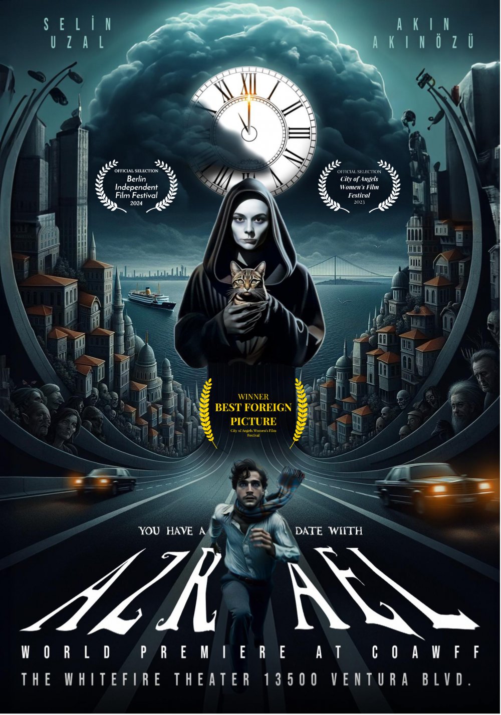 Kiralık Aşk ve Yasak Elma dizilerinde rol alan Selin Uzal, aynı zamanda Amerika’da Peter Joseph imzalı Inter Reflections filminde yer almıştı. Küçük yaştan beri Tim Burton’ın 1988 yapımı Beterböcek filminin etkisine kaldığını söyleyen Uzal’ın bu ilk kısa filmi, ölüm korkusunu ve ölüm gerçekliğini fantastik bir dünyada ele alıyor. Kara komedinin absürt bir üslupla harmanlandığı Azrael’in başrollerini Selin Uzal ve Akın Akınözü paylaşıyor.