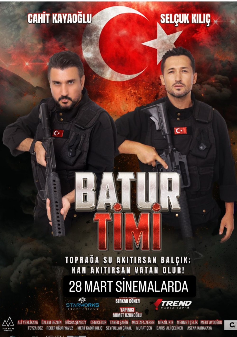 Starworks Productions'ın yapımını, Serkan Döner'in yönetmenliğini üstlendiği ve Selçuk Kılıç'ın başrolünü oynadığı Batur Timi filmi 28 Mart'ta Türkiye ve Avrupa'da vizyona giriyor. Aksiyon sahneleriyle şimdiden merak edilen filmde Selçuk Kılıç, Cahit Kayaoğlu, Ali Yerlikaya, Özlem Gezgin, Mehmet Çelik, Mustafa Zerren, Mikail Kır, Feyza Boz, Mert Aydoğdu, Cem Cesur, Taner Şahin, Barış Çeliker, Murat Seyfullah, Çakal gibi oyuncular yer alıyor. Daha önce Payitaht ve Ben Bu Cihana Sığmazam dizilerinde rol alan eski dünya kickboks şampiyonu Selçuk Kılıç filmdeki performansıyla dikkat çekiyor.
