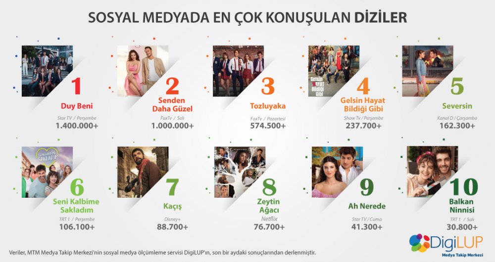 Yaz sezonu boyunca ekrandaki dizileri mercek altına alan DigiLUP, dizilerin ağustos ayındaki sosyal medyadaki yansımalarını inceledi. DigiLUP sonuçlarına göre, Ağustos ayında, sosyal medyada en çok konuşulan dizi Perşembe akşamları Star TV’de yayınlanan Duy Beni dizisi oldu.