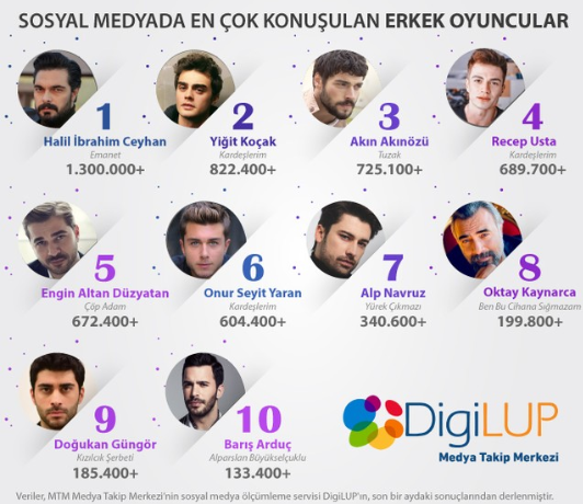MTM Medya Takip Merkezi’nin profesyonel sosyal medya dinleme servisi DigiLUP verilerine göre, son 1 aydaki erkek oyuncular sıralamasında, zirvede Emanet dizisinde rol alan Halil İbrahim Ceyhan var.