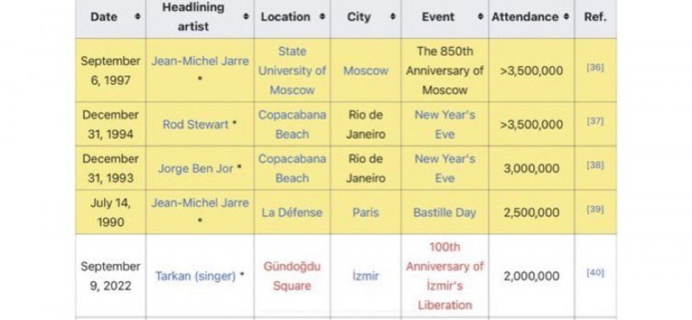 Tarkan'ın dün İzmir'de verdiği konser dünya tarihine geçti. Yaklaşık 2 milyon vatandaşın katıldığı konser, 'En kalabalık ücretsiz konserler' listesinde 5. sıraya oturdu.