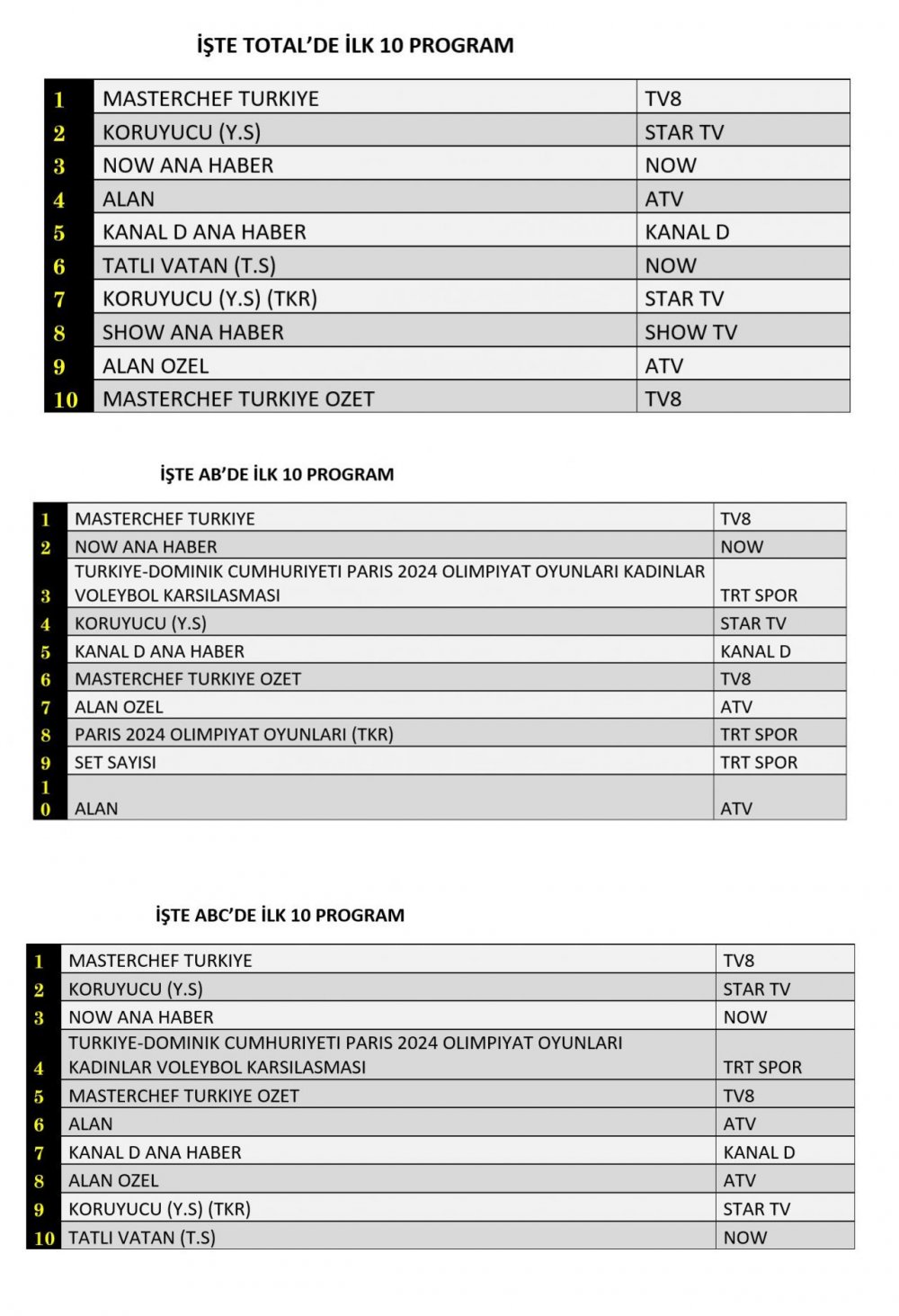 AB'de 1.sırada “Masterchef Türkiye”, 2.sırada “Now Ana Haber”, 3.sırada TRT Spor’da ekrana gelen “Türkiye-Dominik Cumhuriyeti Paris 2024 Olimpiyat Oyunları Kadınlar Voleybol Karşılaşması” yer aldı.