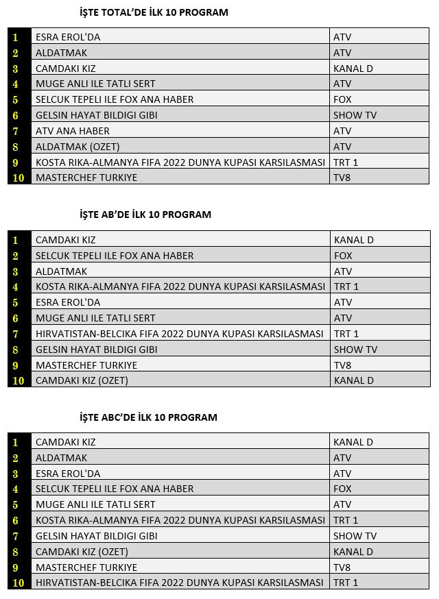 Total'de 1. sırada Atv’de izleyiciyle buluşan “Esra Erol’da”, 2. sırada Atv’de ekrana gelen “Aldatılmak”, 3. sırada Kanal D’de yayınlanan “Camdaki Kız” yer aldı.