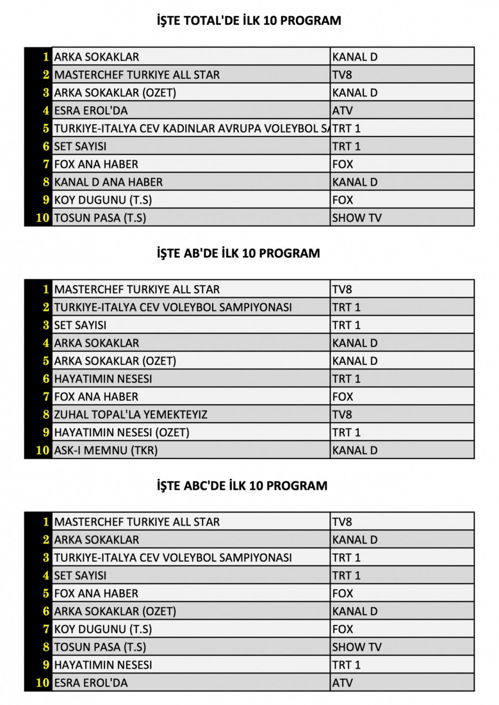 Total’de 1. sırada Kanal D’de izleyici ile buluşan “Arka Sokaklar”, 2. sırada TV8’de ekranlara gelen “MasterChef Türkiye All Star”, 3. sırada ise “Arka Sokaklar” özet bölümü yer aldı.