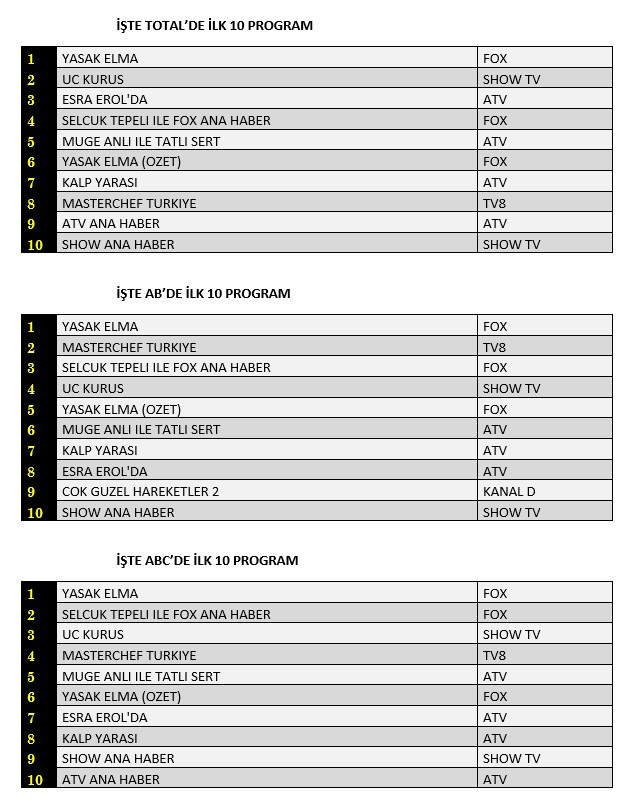AB'de ise 1. sırada “Yasak Elma”, 2. sırada TV8’de yayınlanan “Masterchef Türkiye” 3. sırada “Selçuk Tepeli İle Fox Ana Haber”, 4. sırada Show TV’de ilk bölümü ekrana gelen “Üç Kuruş” yer aldı.