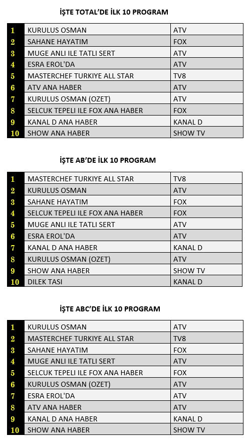 AB'de ise 1. sırada TV8’de ekrana gelen “Masterchef Türkiye All Star”, 2. sırada “Kuruluş Osman”, 3. sırada Fox TV’nin yeni dizisi “Şahane Hayatım” yer aldı.