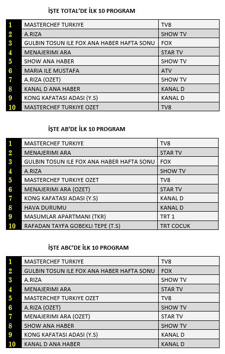 AB'de ise 1. sırada “Masterchef Türkiye”, 2. sırada Star TV’de yayınlanan “Menajerimi Ara”, 3. sırada “Gülbin Tosun İle Fox Ana Haber Hafta Sonu” yer aldı.