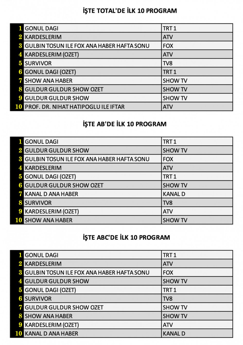Total’de 1. sırada TRT 1’de izleyici ile buluşan “Gönül Dağı”, 2. sırada ATV’de ekranlara gelen “Kardeşlerim”, 3. sırada ise FOX TV’de yayınlanan “Gülbin Tosun İle Fox Ana Haber Hafta Sonu” yer aldı.