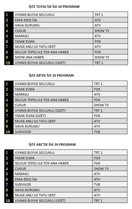 AB'de ise 1. sırada “Uyanış Büyük Selçuklu”, 2. sırada Fox TV’de yayınlanan “Yasak Elma”, 3. sırada ATV’de ekrana gelen “Maraşlı” yer aldı.
