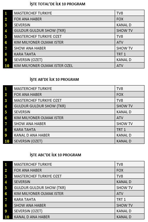 AB'de ise 1.sırada “Masterchef Türkiye”, 2.sırada “Fox Ana Haber” 3.sırada Kanal D’de yayınlanan yabancı sinema “Masterchef Türkiye”nin özeti yer aldı.
