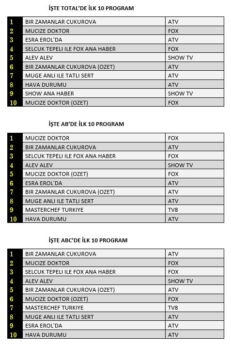 Total'de 1. sırada ATV’de yayınlanan “Bir Zamanlar Çukurova”, 2. sırada Fox TV’de ekrana gelen “Mucize Doktor”, 3. sırada ATV’de izleyici ile buluşan “Esra Erol’da” yer aldı.