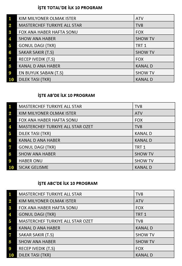 AB'de ise 1.sırada “Masterchef Türkiye All Star”, 2.sırada “Kim Milyoner Olmak İster”, 3.sırada “Fox Ana Haber Hafta Sonu” yer aldı.