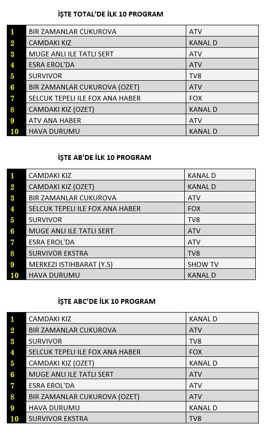 Total'de 1. sırada ATV’de ekrana gelen “Bir Zamanlar Çukurova”, 2. sırada Kanal D’de yayınlanan “Camdaki Kız”, 3. sırada ATV’de izleyiciyle buluşan “Müge Anlı İle Tatlı Sert” programı yer aldı.