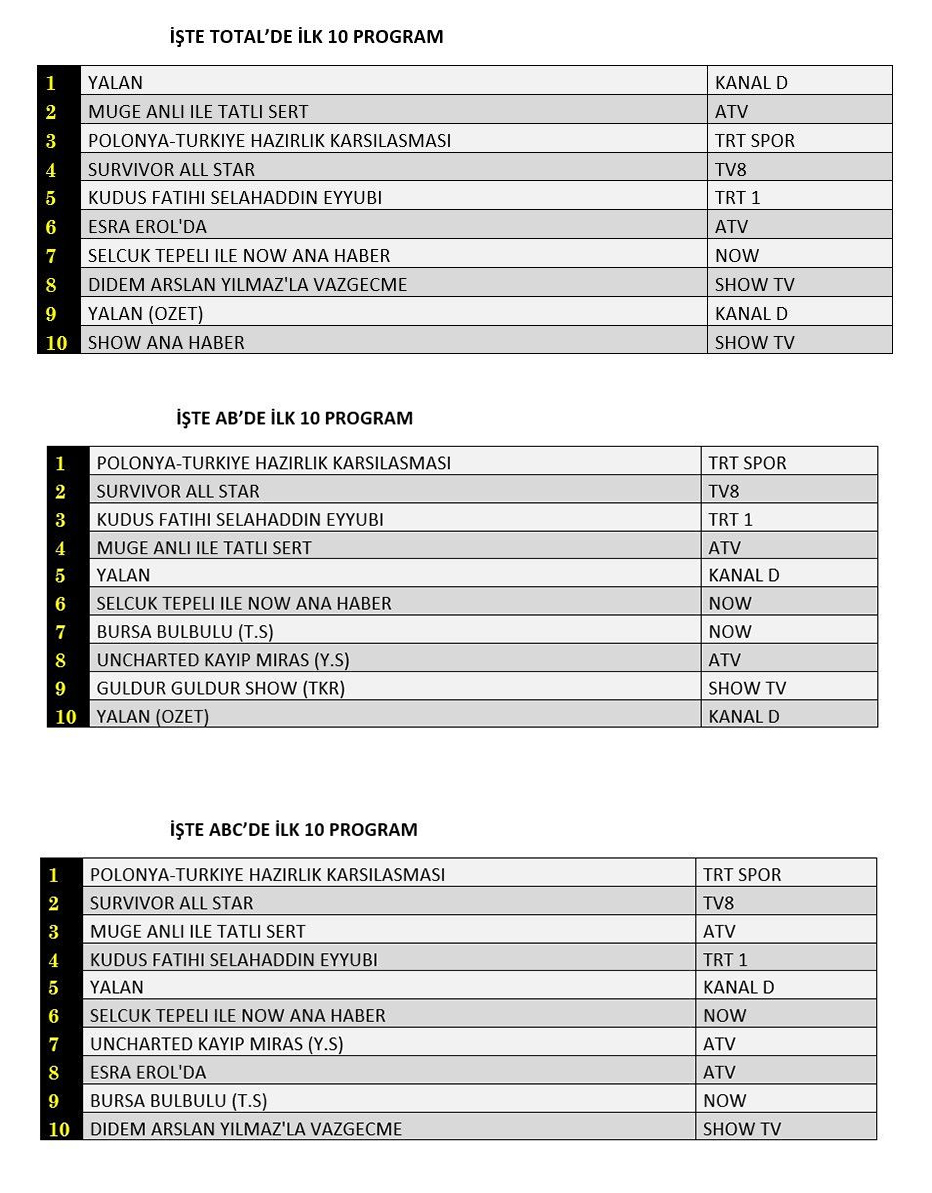 Total'de 1.sırada Kanal D’de izleyiciyle buluşan “Yalan”, 2. sırada Atv’de ekrana gelen “Müge Anlı İle Tatlı Sert”, 3.sırada TRT Spor’da yayınlanan “Polonya-Türkiye Hazırlık Karşılaşması” yer aldı.