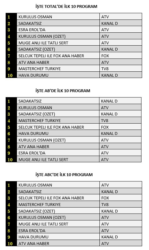 Total'de 1. sırada ATV’de yayınlanan “Kuruluş Osman” 2. sırada Kanal D’de izleyiciyle buluşan “Sadakatsiz”, 3. sırada ATV’de ekrana gelen “Esra Erol’da” yer aldı.