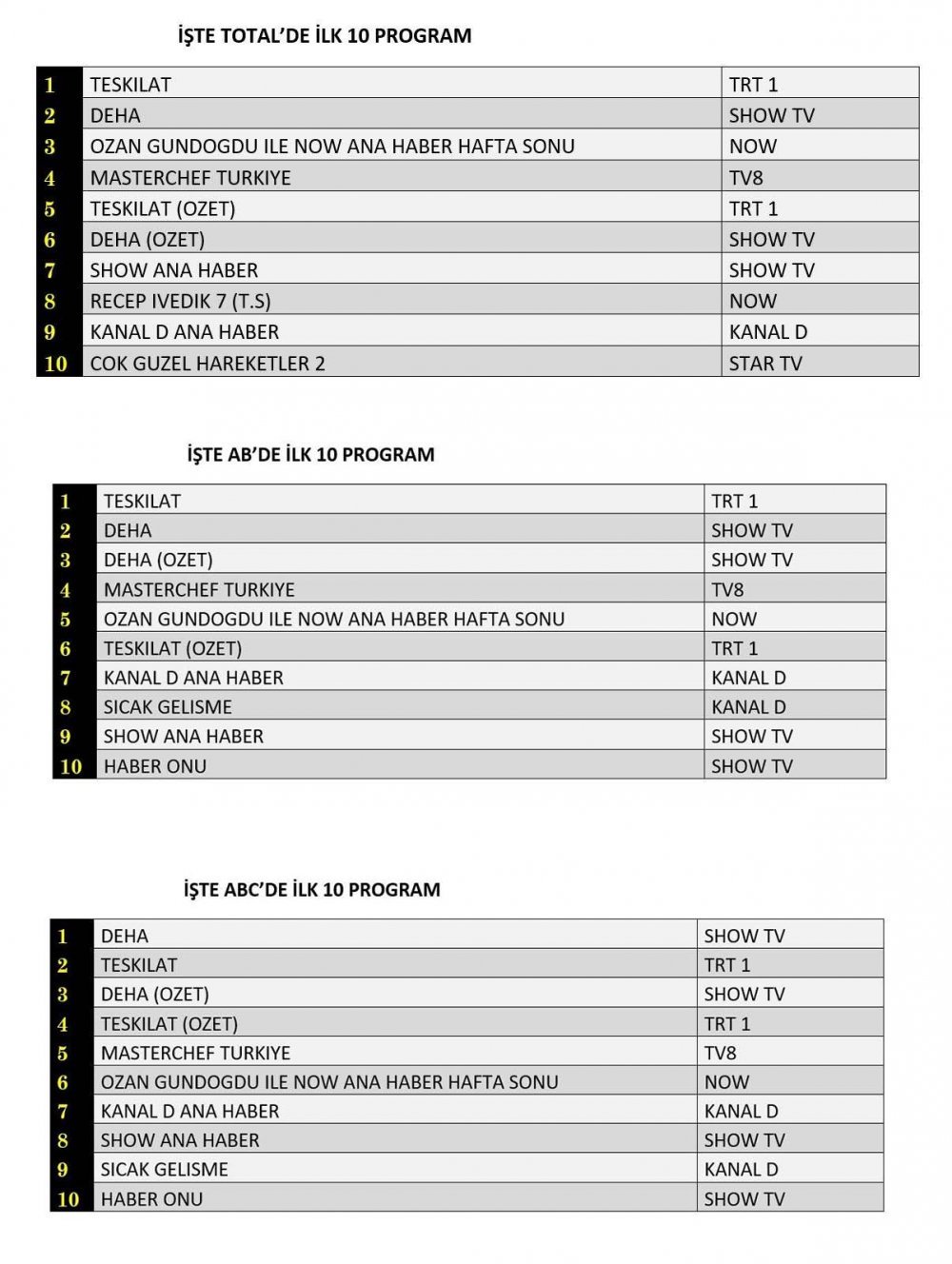 Total'de 1. Sırada: TRT1’de yayınlanan “Teşkilat”, 2. Sırada: Show TV’de izleyiciyle buluşan “Deha”, 3. Sırada: Ozan Gündoğdu İle Now Ana Haber Hafta Sonu" yer aldı.
