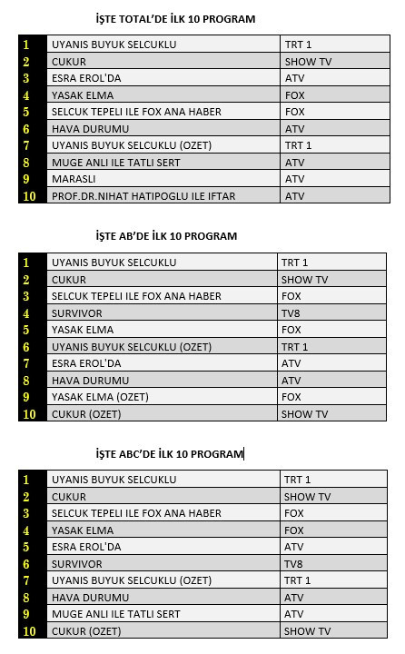 AB'de ise 1. sırada “Uyanış Büyük Selçuklu”, 2. sırada “Çukur”, 3. sırada “Selçuk Tepeli İle Fox Ana Haber” yer aldı.