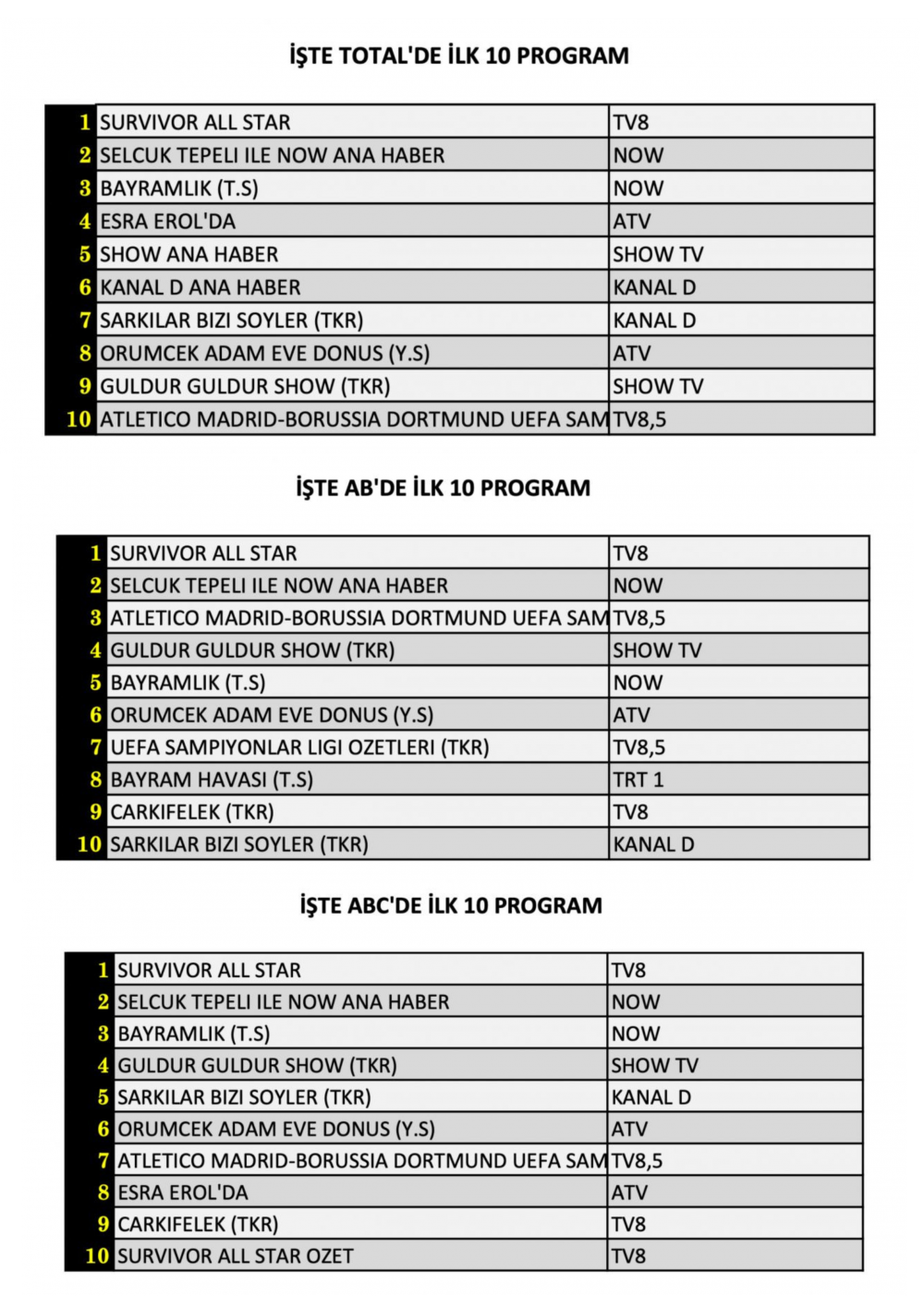 ABC’de 1. sırada “Survivor All Star” ,2. sırada “Selçuk Tepeli ile Now Ana Haber” ,3. sırada ise “Bayramlık” yer aldı.