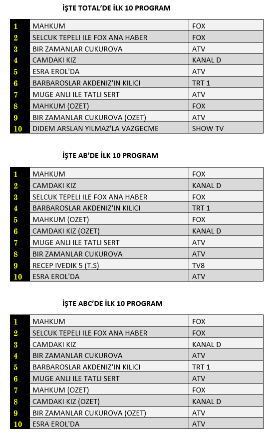 AB'de ise 1. sırada “Mahkum”, 2. sırada Kanal D’de yayınlanan “Camdaki Kız” 3. sırada “Selçuk Tepeli İle Fox Ana Haber” yer aldı.