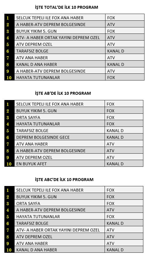 Total'de 1.sırada “Selçuk Tepeli İle Fox Ana Haber”, 2. sırada “A Haber-Atv Deprem Bölgesinde”, 3.sırada Fox TV’de yayınlanan “Büyük Yıkım 5. Gün” yer aldı.