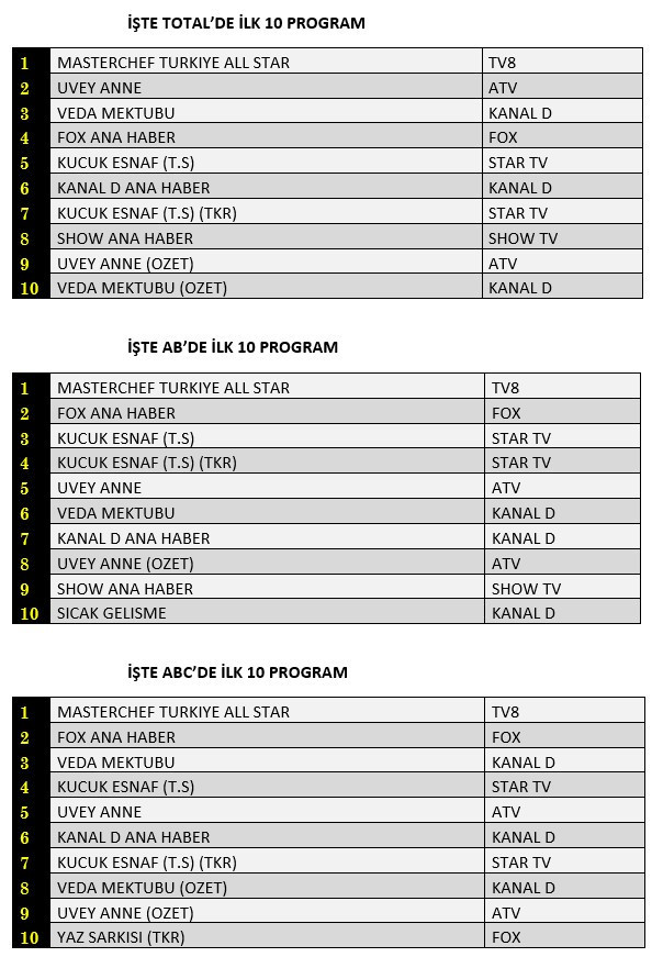 Total'de 1.sırada TV8’de izleyiciyle buluşan “Masterchef Türkiye All Star”, 2. sırada atv’de yayınlanan “Üvey Anne”, 3.sırada Kanal D’de ekrana gelen “Veda Mektubu” yer aldı.