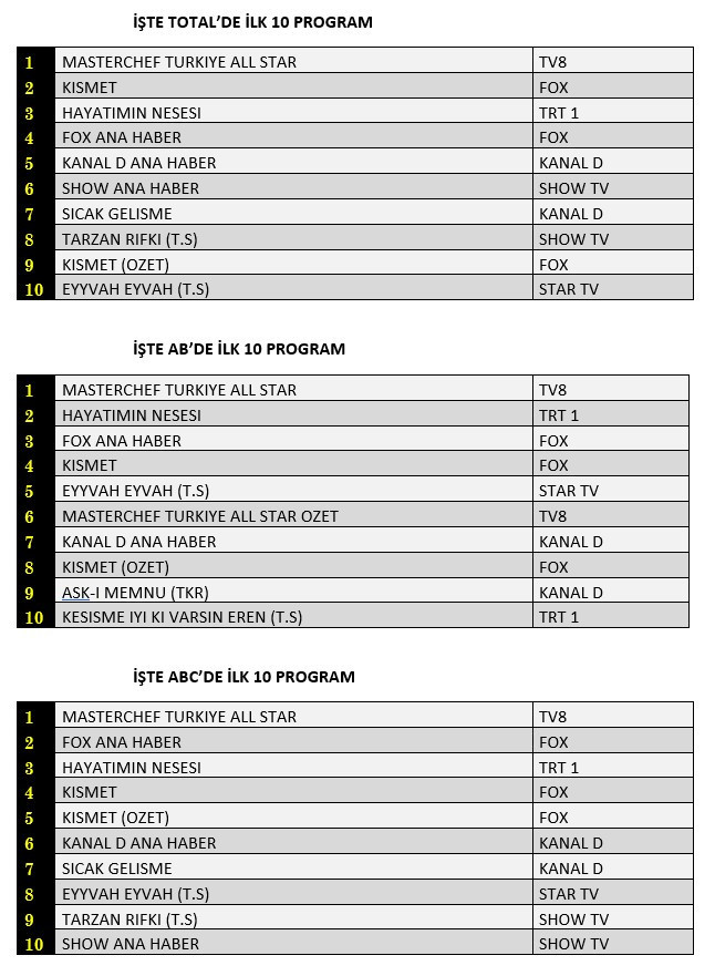 AB'de ise 1. sırada “Masterchef Türkiye All Star”, 2. sırada “Hayatımın Neşesi”, 3. sırada “Fox Ana Haber” yer aldı.