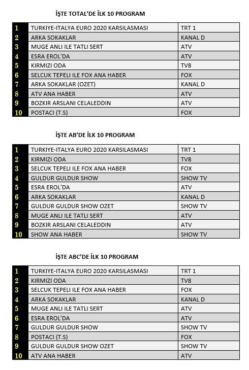 AB'de ise 1. sırada “Türkiye-İtalya Euro 2020 Karşılaşması”, 2. sırada TV8’de yayınlanan “Kırmızı Oda”, 3. sırada “Selçuk Tepeli İle Fox Ana Haber” yer aldı.