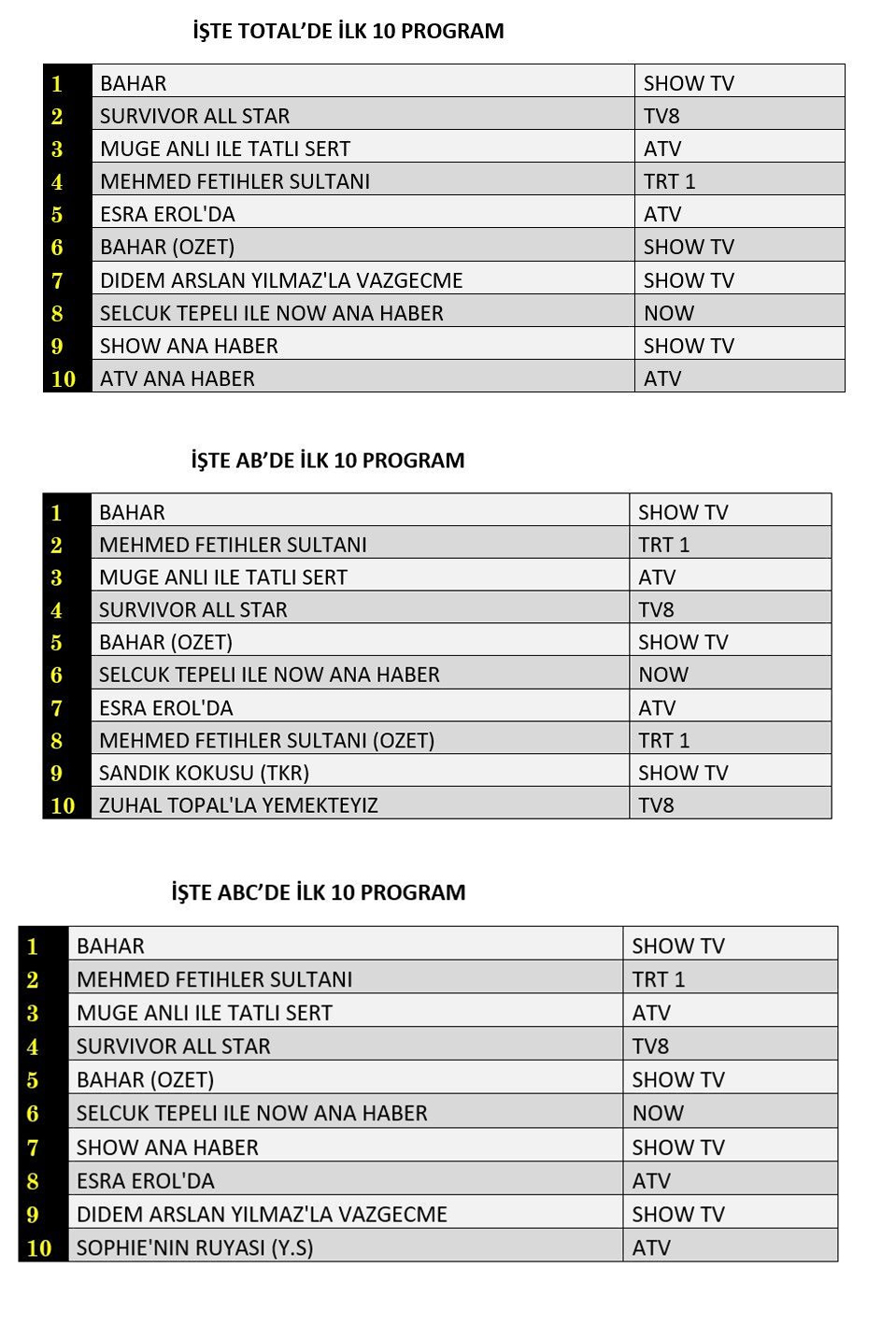 Total'de 1.sırada Show TV’de izleyiciyle buluşan “Bahar”, 2. sırada TV8’de ekrana gelen “Survivor All Star”, 3.sırada Atv’de yayınlanan “Müge Anlı İle Tatlı Sert” yer aldı.