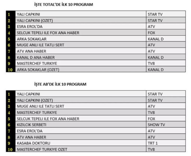 AB’de 1. sırada “Yalı Çapkını”, 2. sırada “Müge Anlı ile Tatlı Sert”, 3. sırada ise “Yalı Çapkını” özet bölümü yer aldı.