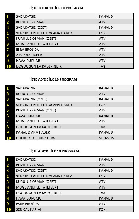 Total'de 1. sırada Kanal D’de yayınlanan “Sadakatsiz”, 2. sırada ATV’de ekrana gelen “Kuruluş Osman”, 3. sırada “Sadakatsiz” dizisinin özeti yer aldı.