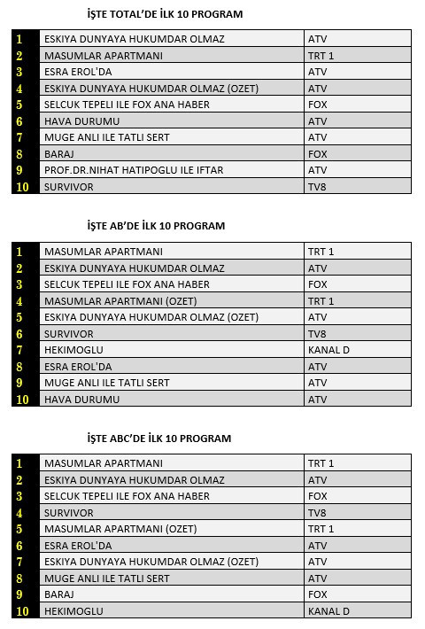 AB'de ise 1. sırada “Masumlar Apartmanı”, 2. sırada “Eşkıya Dünyaya Hükümdar Olmaz”, 3. sırada “Selçuk Tepeli İle Fox Ana Haber” yer aldı.