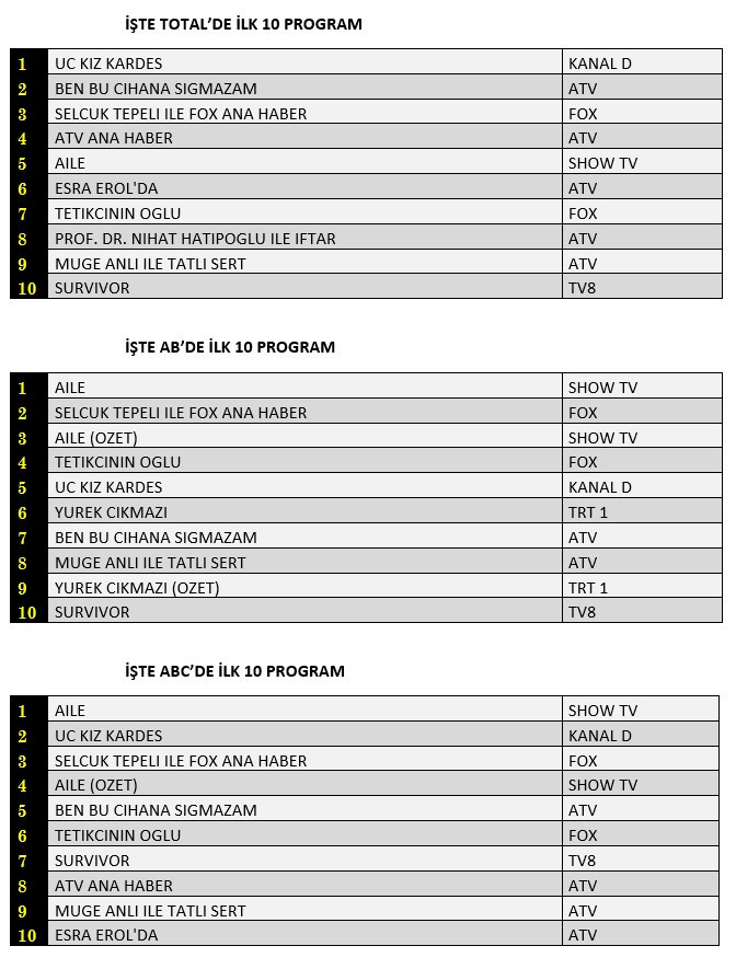 AB'de ise 1. sırada Show TV’de yayınlanan “Aile”, 2. sırada “Selçuk Tepeli İle Fox Ana Haber”, 3. sırada “Aile” dizisinin özeti yer aldı.