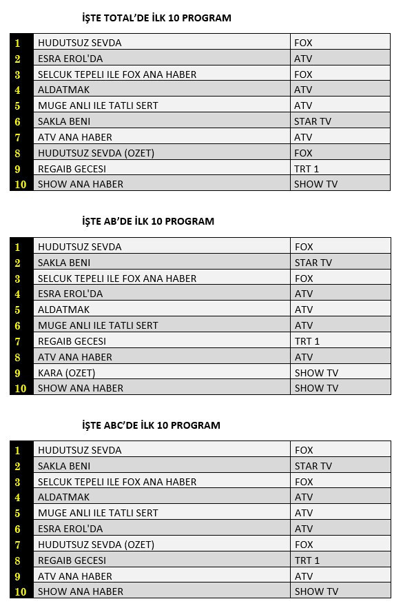 AB'de ise 1.sırada “Hudutsuz Sevda”, 2.sırada Star Tv’de ekrana gelen “Sakla Beni”, 3.sırada “Selçuk Tepeli İle Fox Ana Haber” yer aldı.