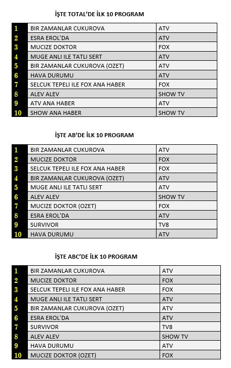 AB'de ise 1. sırada “Bir Zamanlar Çukurova”, 2. sırada “Mucize Doktor”, 3. sırada “Selçuk Tepeli İle Fox Ana Haber” yer aldı.